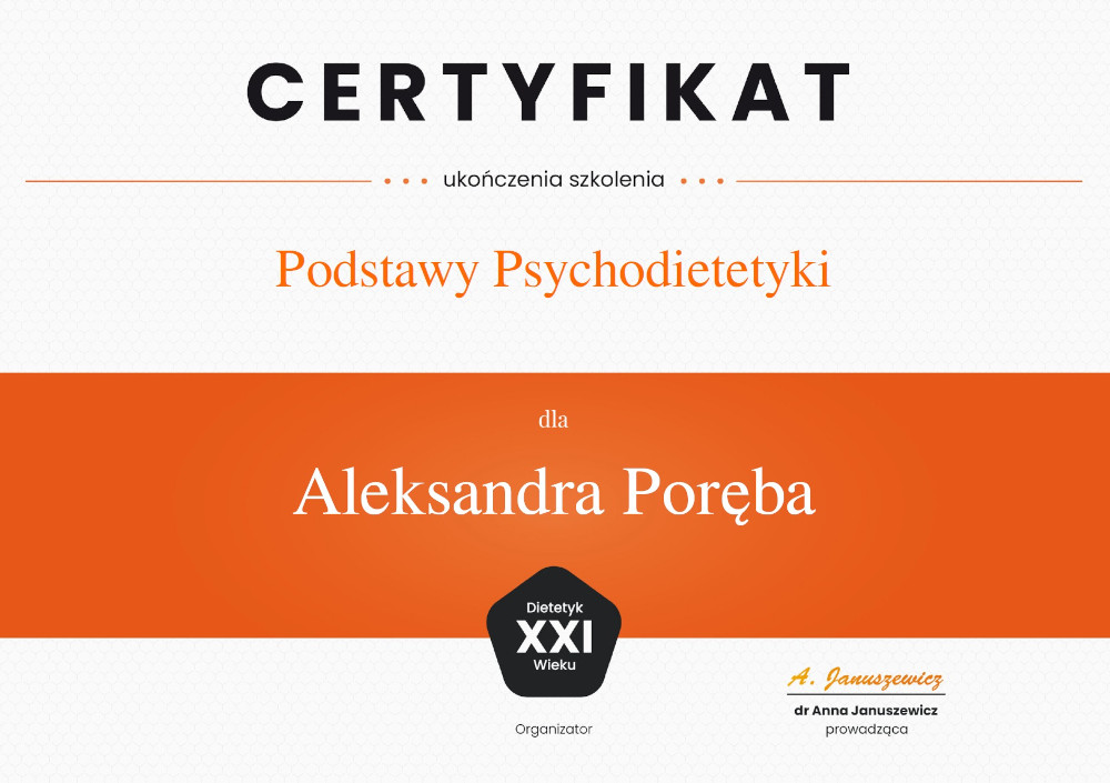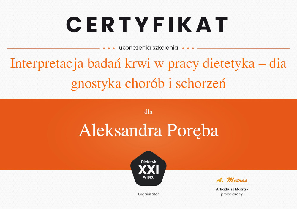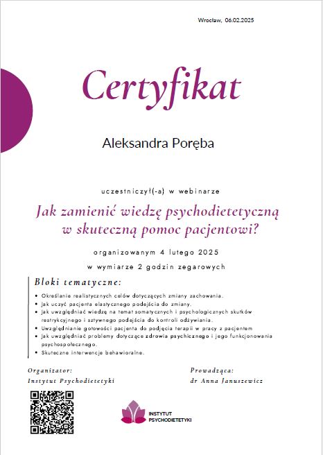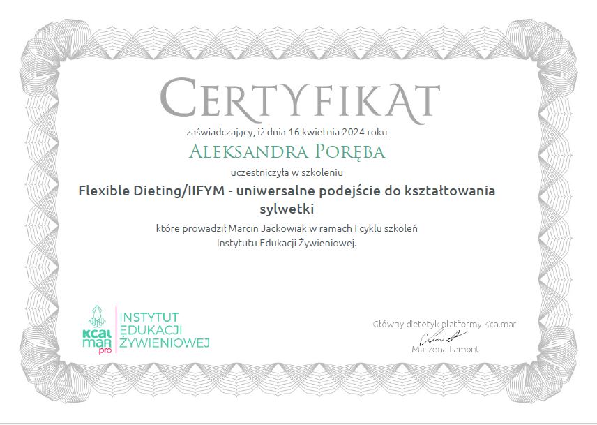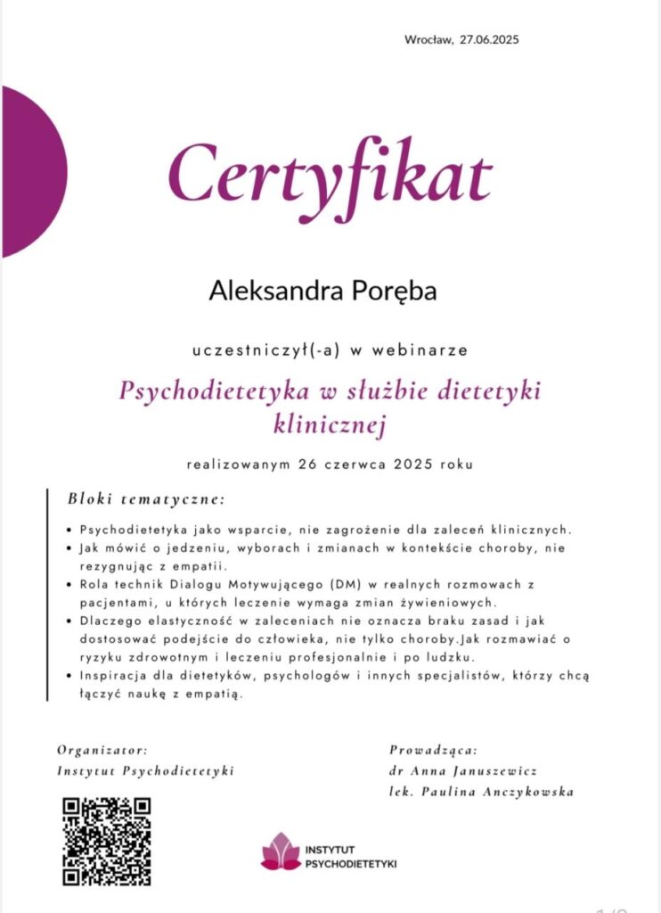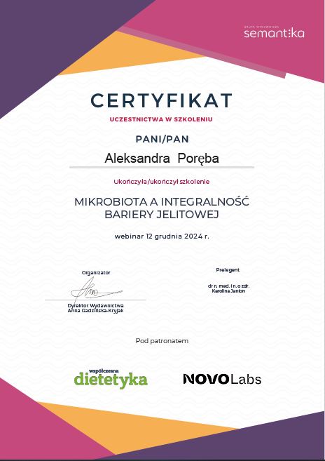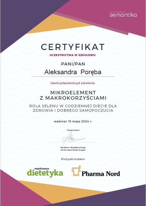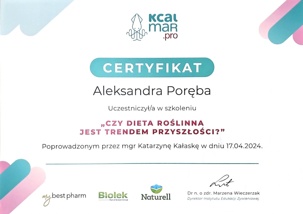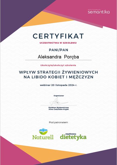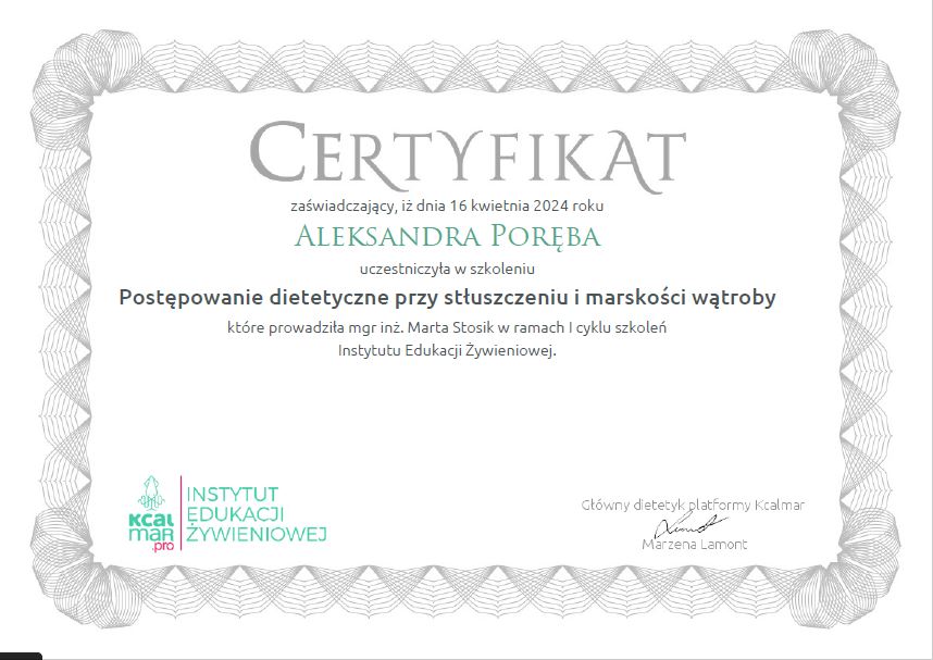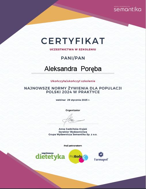 Wciąż dążę do doskonalenia swoich kompetencji i poszerzania wiedzy. Regularnie uczestniczę w szkoleniach, warsztatach i konferencjach branżowych, aby być na bieżąco z najnowszymi badaniami w dietetyce. Moja pasja do nauki nie kończy się tylko na formalnej edukacji. Aktywnie biorę udział w livestreamach z ekspertami z różnych dziedzin zdrowia, sięgam po fachową literaturę i stale analizuje najnowsze publikacje naukowe.