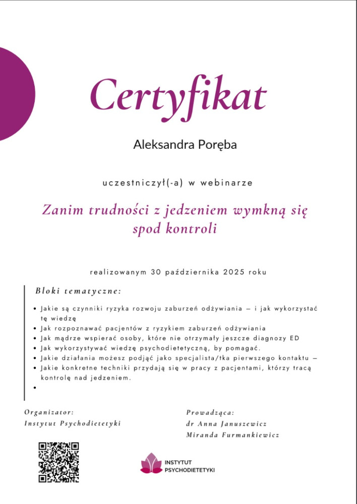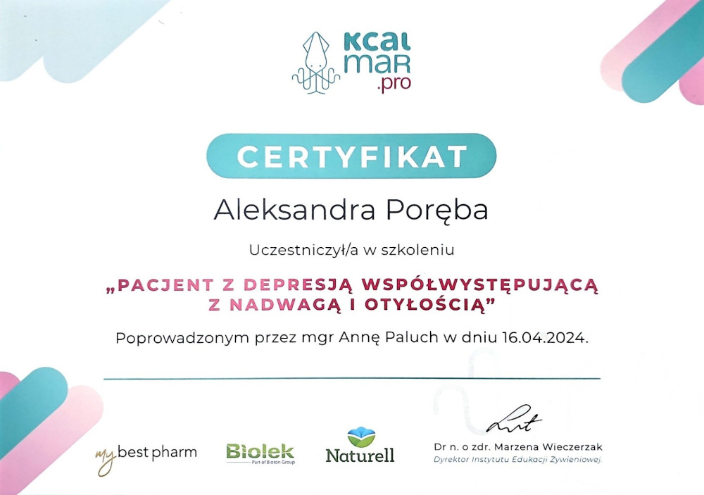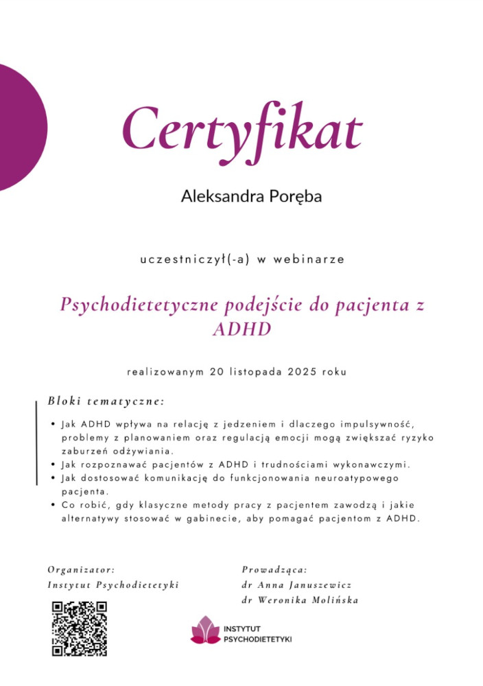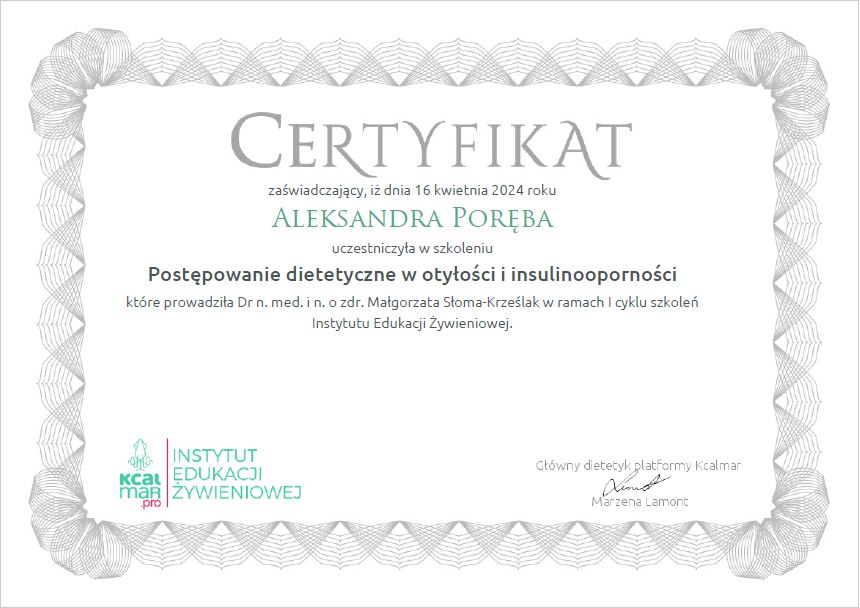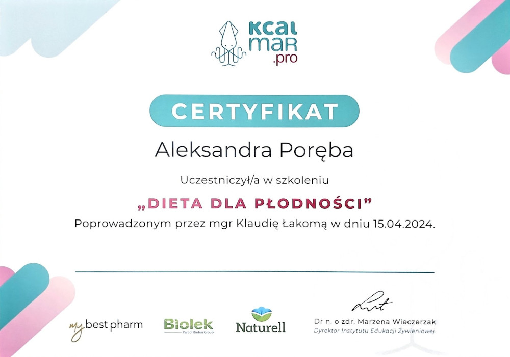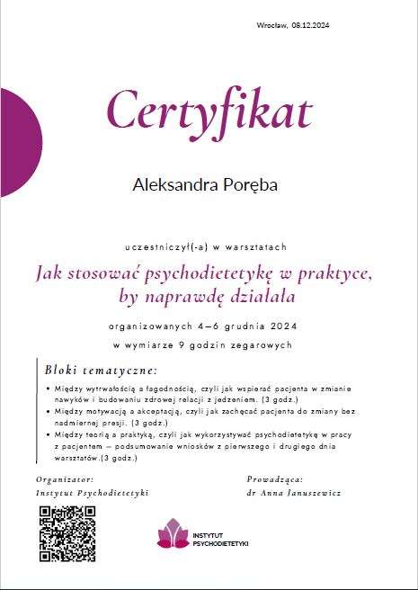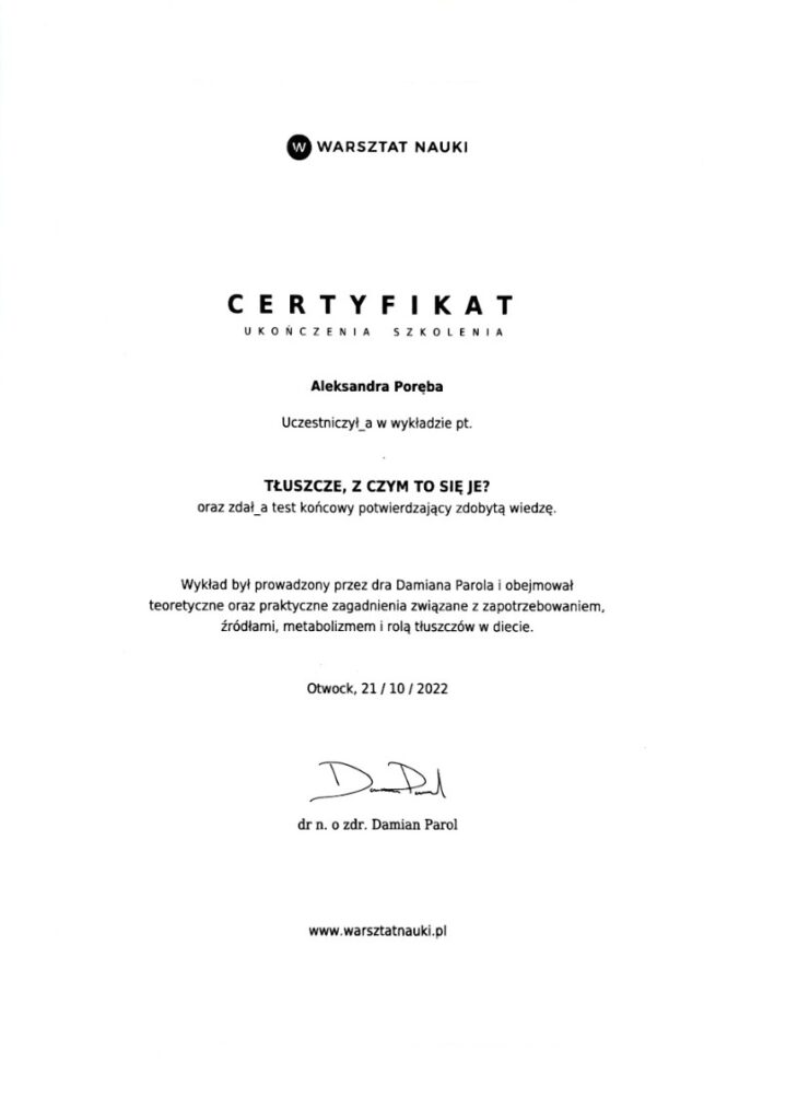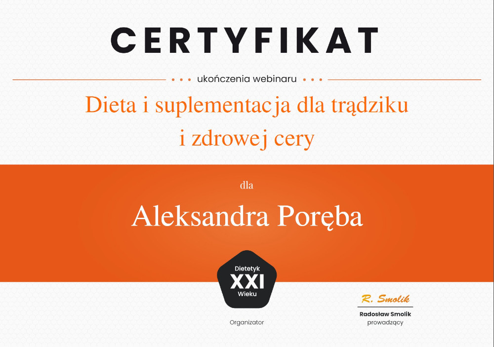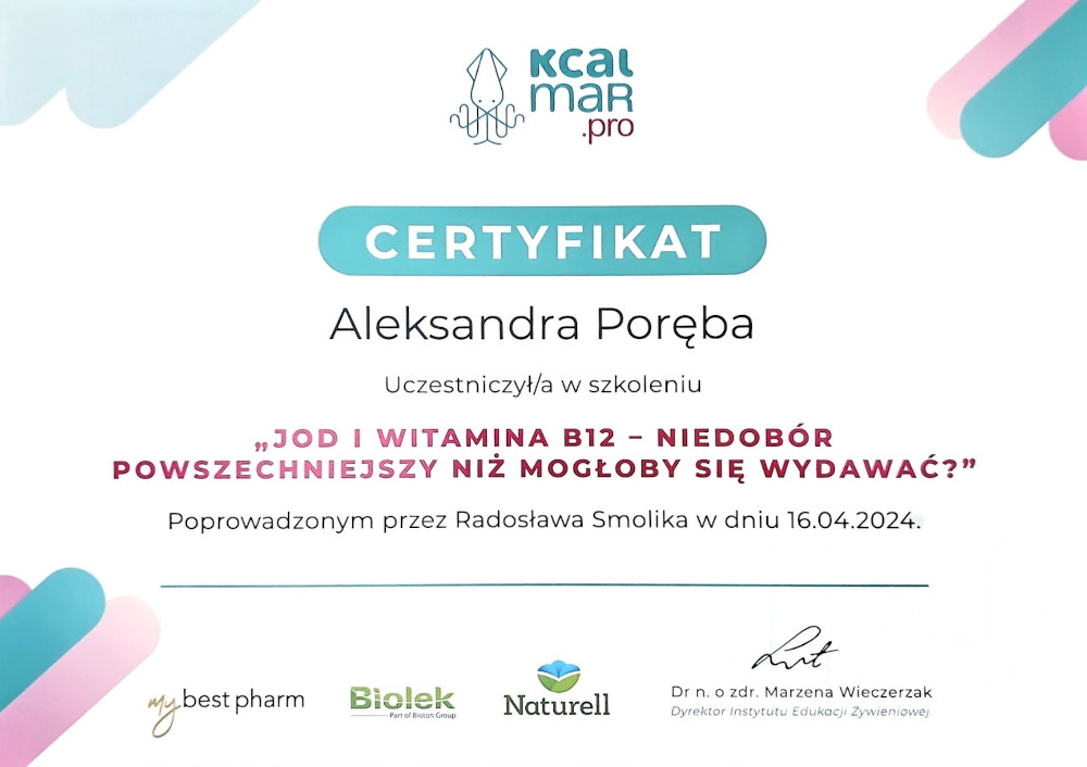 Wciąż dążę do doskonalenia swoich kompetencji i poszerzania wiedzy. Regularnie uczestniczę w szkoleniach, warsztatach i konferencjach branżowych, aby być na bieżąco z najnowszymi badaniami w dietetyce. Moja pasja do nauki nie kończy się tylko na formalnej edukacji. Aktywnie biorę udział w livestreamach z ekspertami z różnych dziedzin zdrowia, sięgam po fachową literaturę i stale analizuje najnowsze publikacje naukowe.