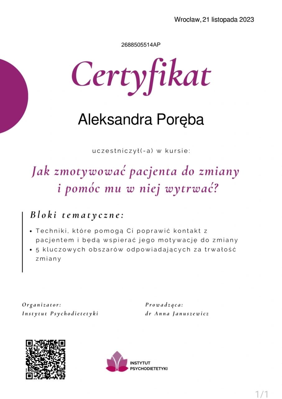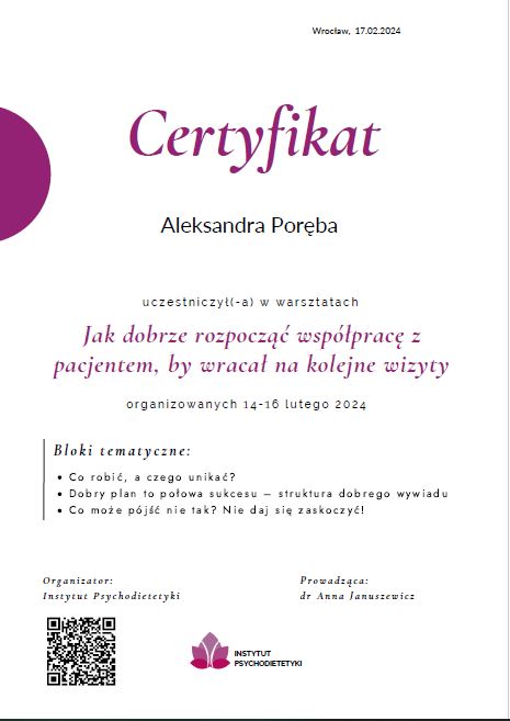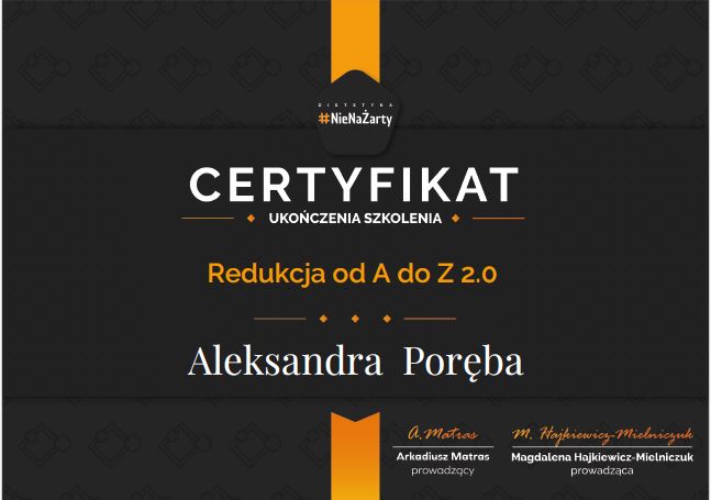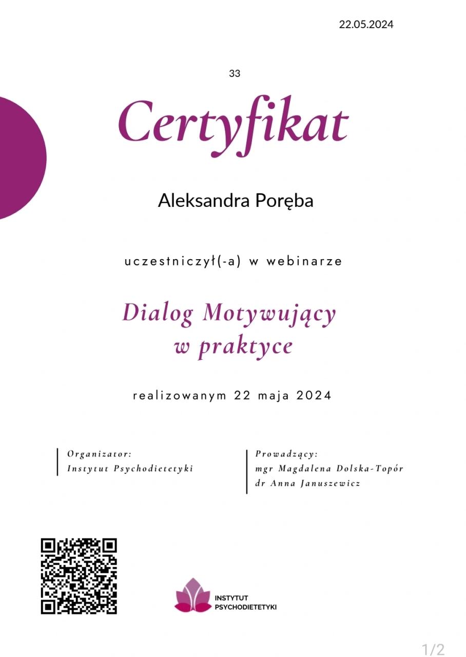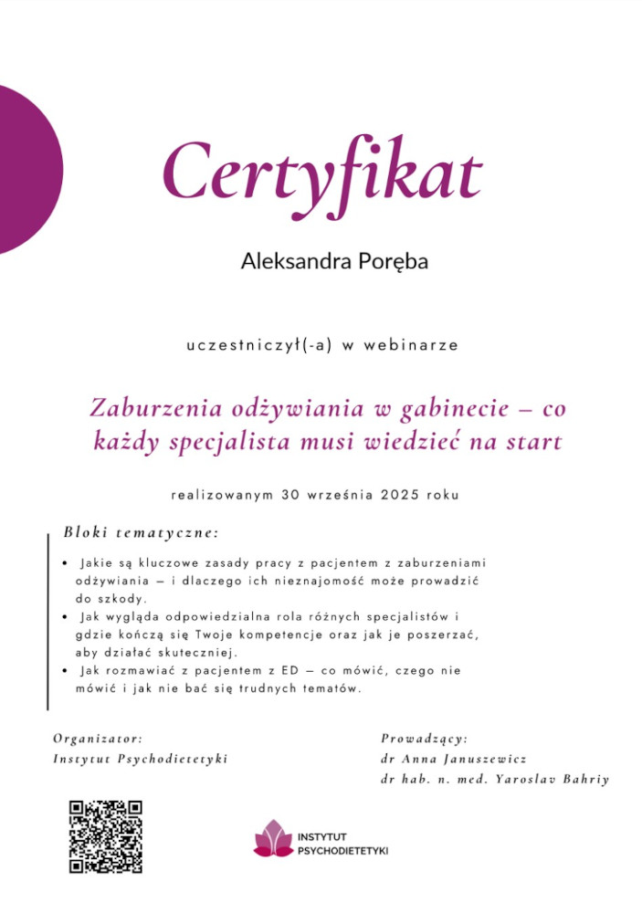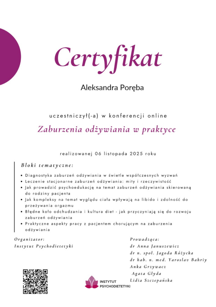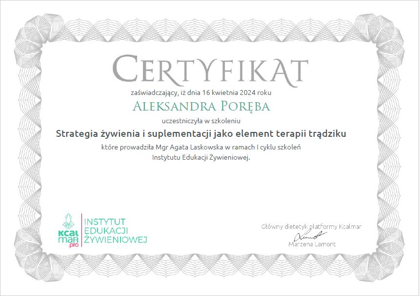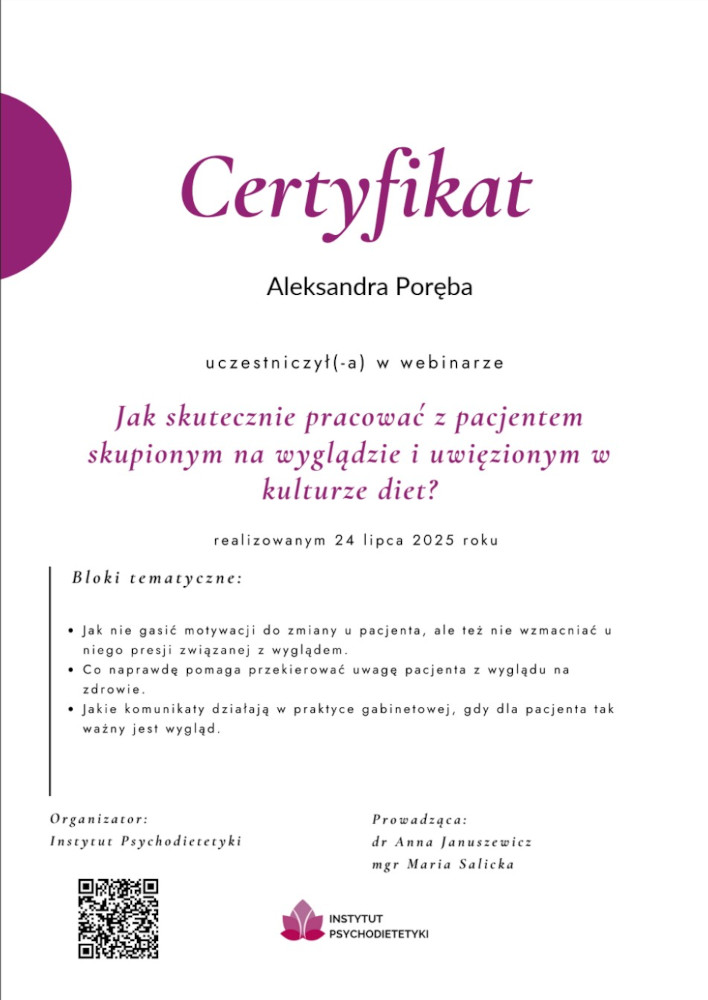 Wciąż dążę do doskonalenia swoich kompetencji i poszerzania wiedzy. Regularnie uczestniczę w szkoleniach, warsztatach i konferencjach branżowych, aby być na bieżąco z najnowszymi badaniami w dietetyce. Moja pasja do nauki nie kończy się tylko na formalnej edukacji. Aktywnie biorę udział w livestreamach z ekspertami z różnych dziedzin zdrowia, sięgam po fachową literaturę i stale analizuje najnowsze publikacje naukowe.